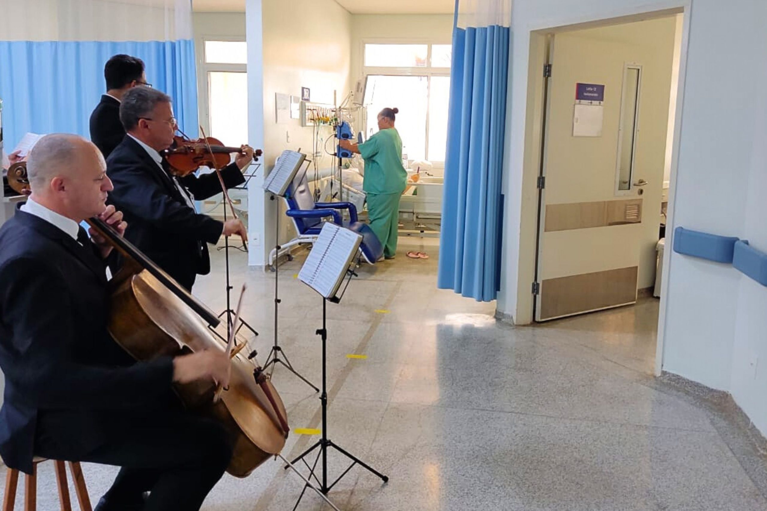 Composto por seis músicos, a orquestra leva louvores escolhidos previamente e a música desempenha um papel fundamental em nosso compromisso de oferecer cuidado humanizado aos nossos pacientes e suas famílias. Essa interação faz parte de nossos esforços para tornar a estadia no hospital mais confortável.